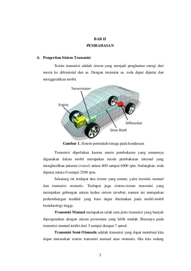 Abstrak Transmisi adalah salah satu dari sistem pemindah tenaga dari mesin ke diferensial kemudian keporos axle yang mengakibatkan roda dapat berputar dan menggerakkan mobil yang berfungsi mendapatkan variasi momen dan kecepatan sesuai dengan